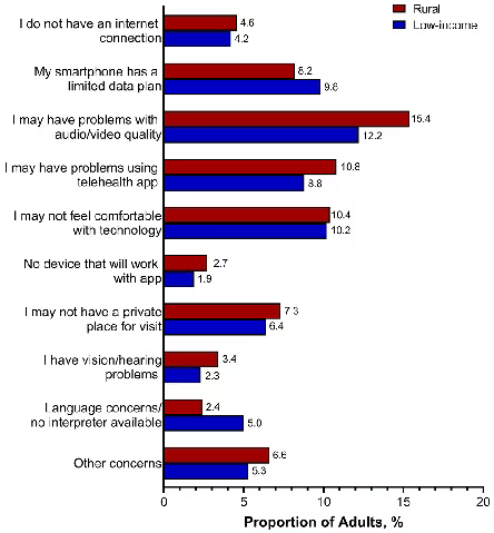 Prevalence of barriers to using telehealth services among rural and low-income adults, weighted to be nationally representative within racial/ethnic groups. Only 57.4% of rural adults and 56.9% of low-income adults reported having no barriers to telehealth use.
